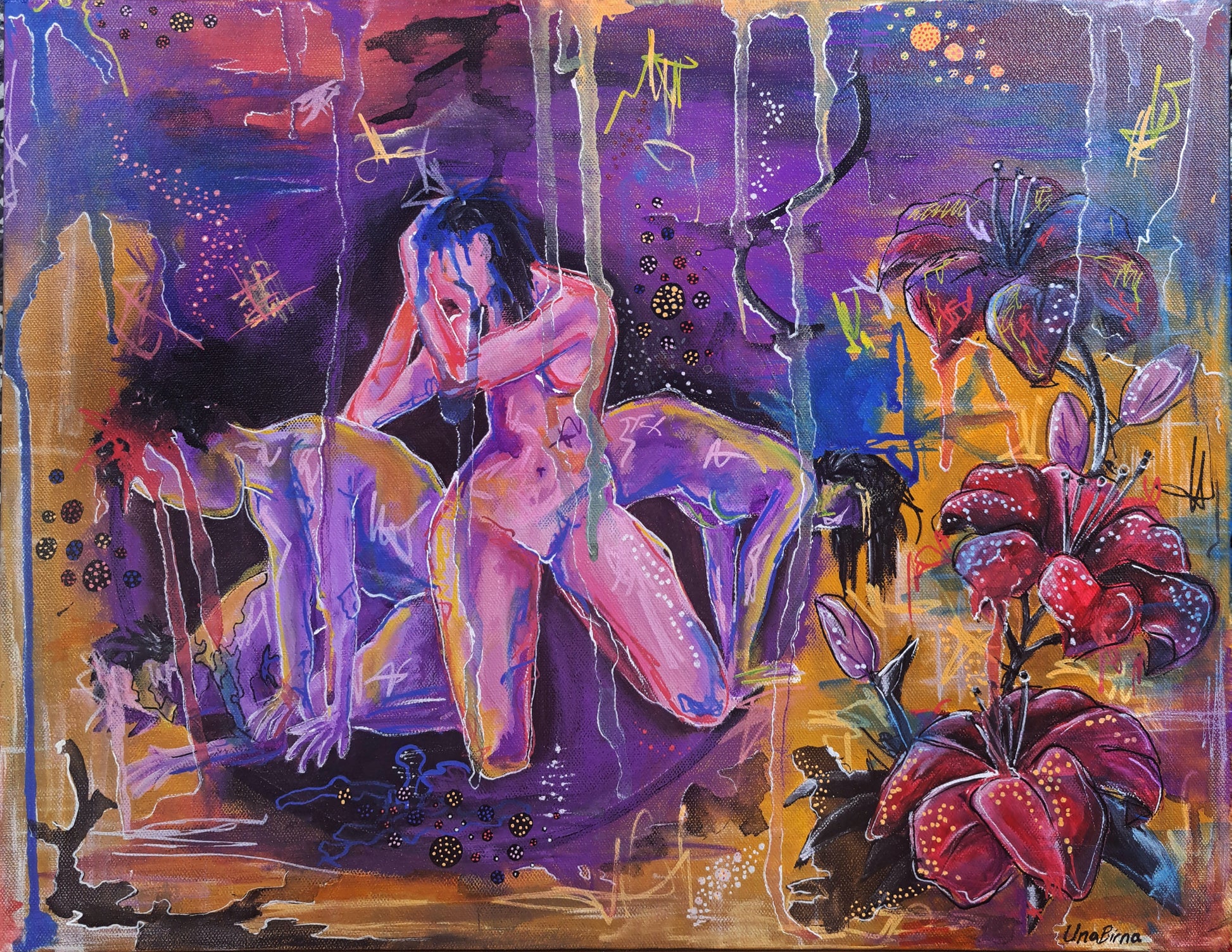Þetta verk fangar innri átök mannsins – þann ósýnilega storm sem geysar innra með okkur þegar tilfinningar, áföll og sjálfsleit takast á. Þrjár persónur blandast saman í líkamlegum og andlegum formum, túlkaðar með hráum pensilstrokum, sterku litavali og flæðandi formi. Þær virðast vera að leita útgöngu, aðstoðar eða sátta – kannski allt í senn.
