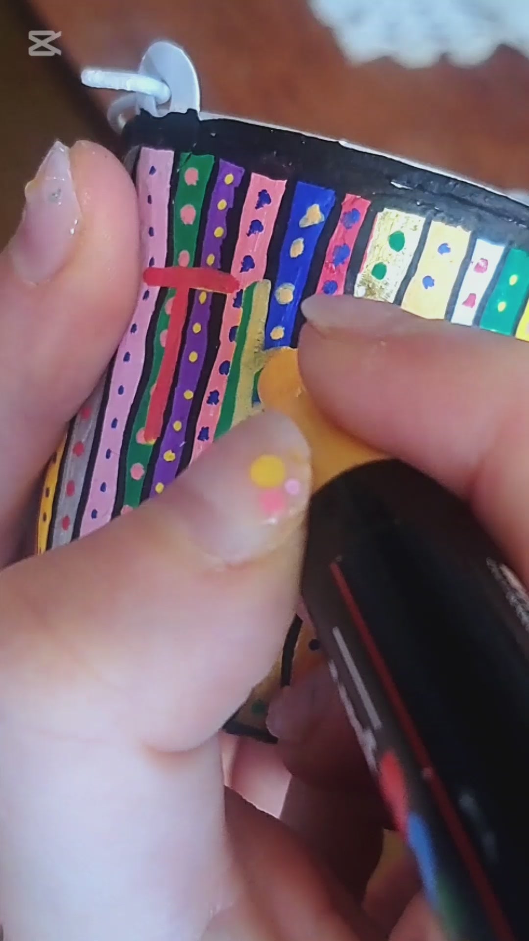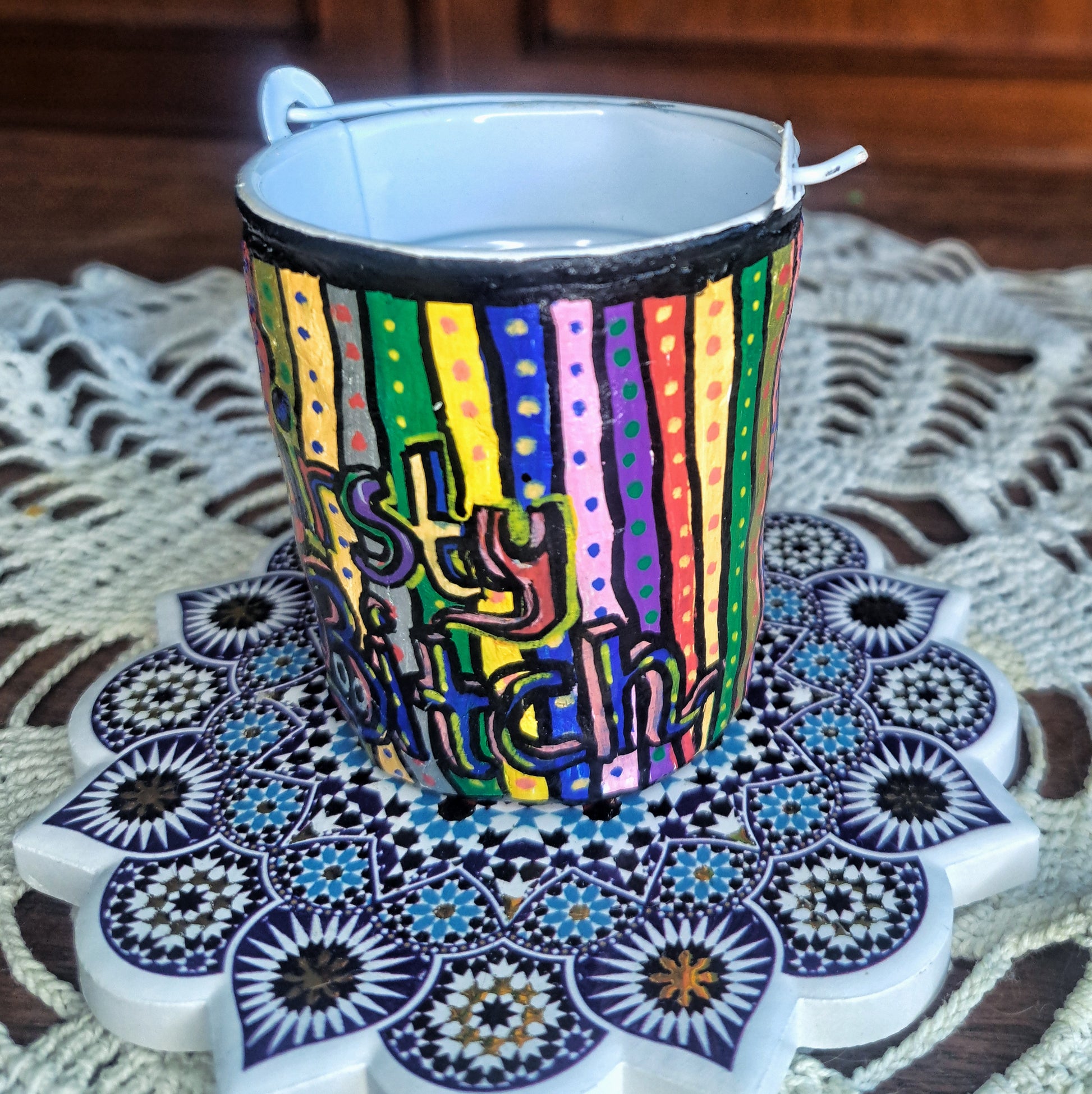 Air dried clay around metal pot inside. Hand painted and brushed with glossy varnish